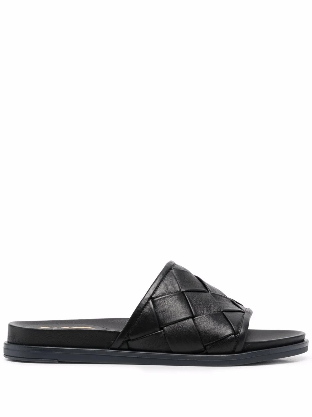 interwoven leather sliders black leather slip-on style interwoven design open toe moulded footbed branded leather insole flat rubber sole Made in Italy Composition Leather 100% SIZE & FIT Measurement HEEL 0.98 in(2.5 cm) Sole height 0.78 in(2 cm)