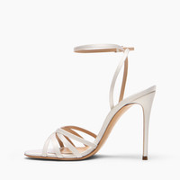 Bold, feminine and timeless: the Julia sandal in white satin is the epitome of elegant seduction. The simple yet striking design features thin straps that delicately hug the foot, while the ankle strap adds stability and a touch of refinement. The 10 cm stiletto heel elongates the silhouette and lends a sculptural elegance, perfect for enhancing any evening outfit or special occasion. Designed for ceremonies, evening events, or elegant dinners, the Satin sandal combines shine and sophistication in a design that enhances every step with charm and femininity. Details - 100% Silk - Blade Heel In Real Steel 100 Mm/ 3.9 Inches - 100% Made in Italy - Code: 1L420B1001SATIN9999
