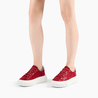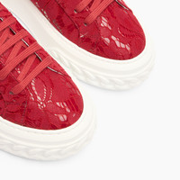 For the Fall Winter 2025 collection, Casadei presents the iconic Off-road Liberty sneaker. In varnished red passion fabric with ton sur ton lace applique, this sneaker is perfect for the fast-paced and adventurous life of modern women, reflecting the active aesthetic with a chic and gritty touch. The low-relief chain, now iconic in all Casadei rubber bottoms, is carved into the ground as in off-road tires to create grip. The metal mesh C-Chain logo is present. Details - Varnished fabric with tone-on-tone lace - 39% Polyurethane, 25% Cotton, 20% Polyester and 16% Nylon - Oversized rubber shoe bottom with bas-relief chain 20 mm / 0.7 inches - 100% Made In Italy - Code: 2X869T0201C28673713