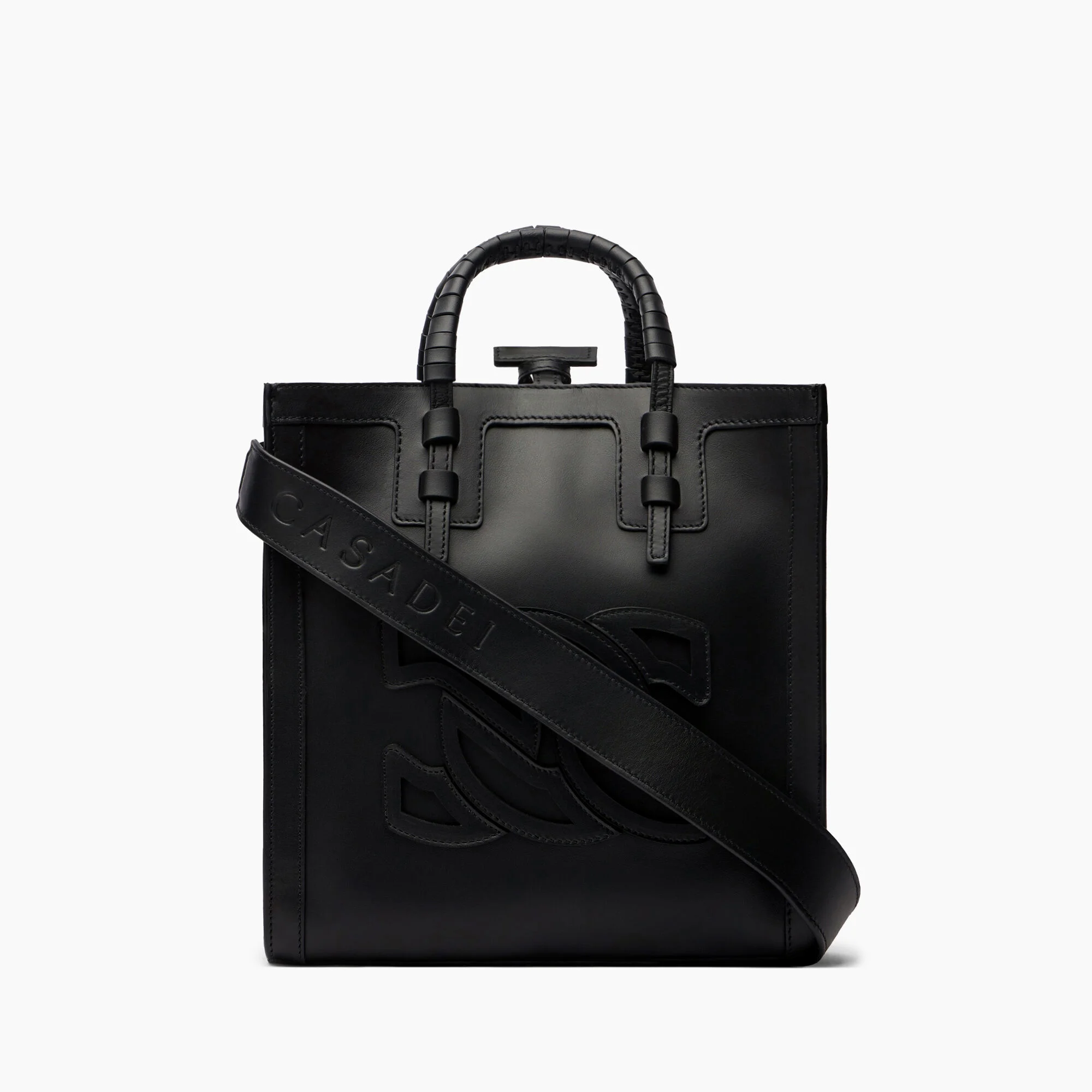 The small bag trend is not going anywhere. The perfect everyday companion, the Ale Bag is defined by simple and elegant lines. Entirely hand-crafted in Italy, this black calf leather bag features a small handle with a clasp and a CASADEI-engraved shoulder strap. The C-Chain logo detail makes this bag one of a kind. Details - Calf Leather - 100% Calf Leather - Lenght 24.5 Cm / Height 25 Cm / Depth 14.5 Cm - Code: 3W383W0000LOVEC9000