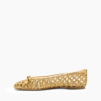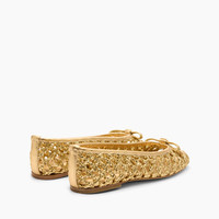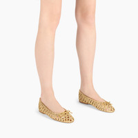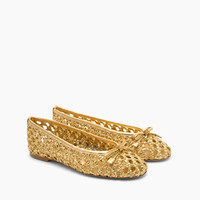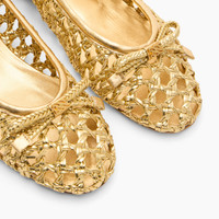 For ballerina lovers, Casadei offers the versilia ballerina for this Spring/Summer 25 season. Made entirely by hand, this elegant weave of gold-colored vegan leather stripes offer unparalleled pampering thanks to slits that ensure perfect breathability. The Maison's iconic C-Chain logo adds a distinctive and inimitable touch to the model. The leather sole completes the work. Details - Synthetic woven - 70% Polyurethane, 17% Polyester and 13% Cotton - Leather Bottom. - 100% Made In Italy - Code: 1A289J0101C28081400