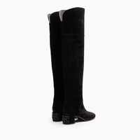 The Fall/Winter 2025-2026 collection is a perfect balance of comfort and style. The over-the-knee boot on the chunky, well-potted Muni heel offers a streamlined silhouette and a solid base designed for everyday wear without ever losing its sophistication. The real innovation of this boot is its versatility: the top of the boot leg can be turned up, like a shirt sleeve. You can choose to leave it high for an elegant and refined look, or turn the cuff up for a more casual and dynamic effect. The thick C-Chain inlay on the heel adds a distinctive and sophisticated touch, giving each step a unique and recognizable allure. In black suede, it is ideal for those seeking elegance and practicality. Perfect for any occasion, this model embodies the season's versatility and timeless elegance. Details - Suede - 100% calf - Leather covered heel with the C-Chain inlay 50 mm / 1.9 inches - 100% Made In Italy - Code: 1T081A0501NOMAD9000