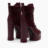 The Nancy platform ankle boot in ruby-coloured suede and smooth ton-sur-ton leather inserts is presented as a metropolitan ankle boot on a rubber tank bottom. The vertiginous chunky heel is balanced by a sturdy platform to guarantee stability and practicality. The lace-up fastening detail with small metal hooks makes this model perfect for tackling winter with style and character. Details - Suede - 100% Calf - Leather covered heel 120mm/4.7 inches with plateau 40 mm/1.5 inches - 100% Made In Italy - Code: 1R538A1201NOMAD3702