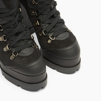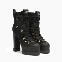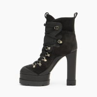 The Nancy platform ankle boot in black suede and smooth tonal leather inserts is a metropolitan ankle boot on a rubber tank bottom. The vertiginous chunky heel is balanced by a sturdy platform to guarantee stability and practicality. The lace-up fastening detail with small metal hooks makes this model perfect for tackling winter with style and character. Details - Suede - 100% Calf - Leather covered heel 120mm/4.7 inches with plateau 40 mm/1.5 inches - 100% Made In Italy - Code: 1R538A1201NOMAD9000