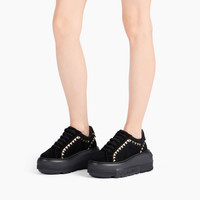 The Nexus sneaker gets a new light with a bold and sophisticated interpretation. Made of black suede leather, it is distinguished by an ultra-light wedge and a techno-futuristic bottom design designed to combine comfort and metropolitan style. A refined decoration of gold metallic triangles surround the foot like a modern jewel. The iconic C-Chain detail and maxi logo on the side complete the design with a recognizable and distinctive touch. A statement model, born for those who love to get noticed with class. Details - Suede calfskin leather - 100% calf - Ultra-light wedge with the Casadei logo on the outside and C-chain logo underneath the sole 70 mm / 2.7 inches - 100% Made In Italy - Code: 2X090A070NC29119000