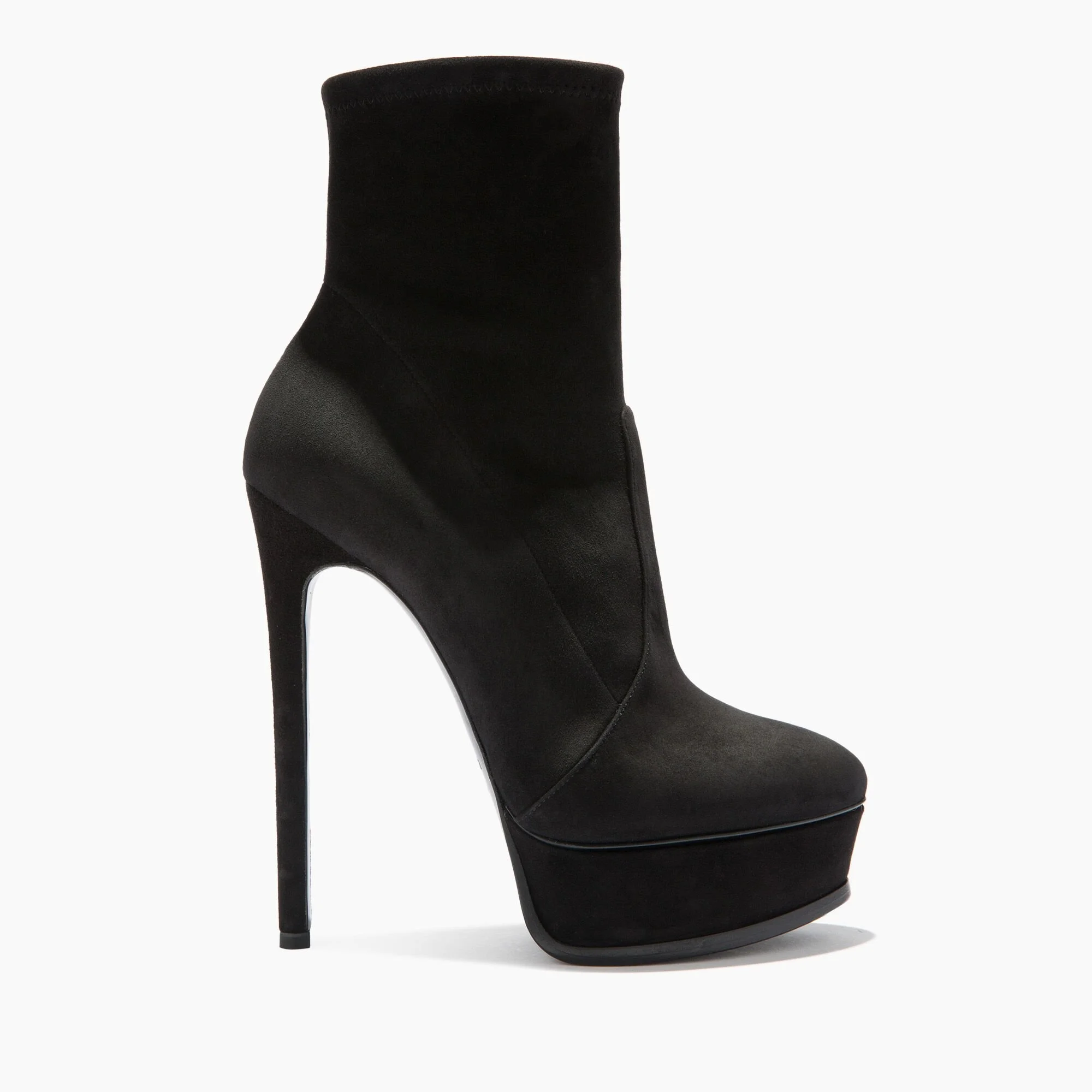 The seductive feel of these stretch suede ankle boots is emphasised by the towering stiletto heel, which is softened by the sinuous platform and adds a glamorous accent to the female form. These ankle boots thus becomes the perfect luxury accessory for urban-chic style with a bold feel. Details - Born to make a statement, these ankle boots are set on a towering stiletto heel while the platform balances the fit. The stretch suede gives a second-skin feel and makes them easy to wear. - Code: 1R627L1401T00059000
