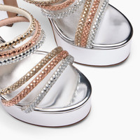 Casadei presents the new Patty Platform, combining height and stability to offer grit and momentum without sacrificing comfort. Designed to add a few extra centimetres, this model stands out for its mirror-effect fabric on a silver metallic base and the elegant multicoloured tubular details that adorn it. The 13 cm chunky heel is balanced by an 8 cm platform. Designed for those who want bold and decisive elegance. Ideal for summer parties, glamorous events, and evenings when you want to shine with style and personality. Details - Upper in micro rhinestones - 100% Polyester with glass - Thin Heel Covered In Andromeda Mirror-Effect Fabric 80 Mm / 3.1 Inches - 100% Made in Italy - Code: 1M514B1301C29679700