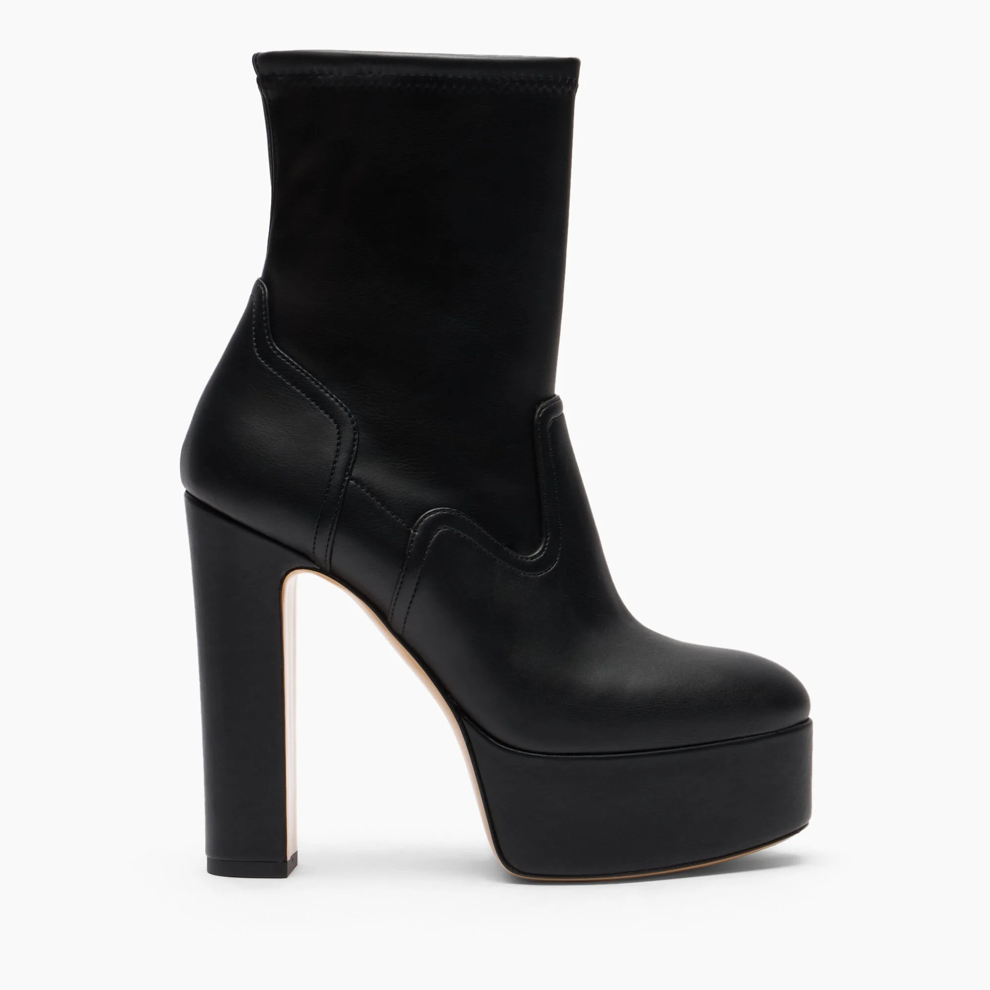 The Patty platform is a manifesto of never-shouted sensuality. Made entirely in Italy, this scenic model with a round, short and delicate shape is ideal for all those who love heights and all-day comfort. This practical black vegan stretch nappa leather ankle boot is enhanced by chunky heel that balances the platform to ensure stability and practicality. Details - Stretch vegan nappa leather with a sporty and distinctly natural look - 60% Polyurethane and 40% Polyester - Vegan leather covered heel 130 mm / 5.1 inches with plateau 30 mm / 1.18 inches - 100% Made In Italy - Code: 1R532A1301LAABD9000