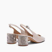 Clean lines and refined details define the elegance of Casadei's Reflex slingback. Crafted from soft ecru leather, this essential shoe is embellished with the Cleo heel, enhanced by the Reflex finish: a refined laser engraving that recreates a woven effect, enhanced by the silver metallic finish, capable of capturing the light with surprising perspective effects. The adjustable strap with C-Chain completes the design with an iconic touch. Perfect for wearing all day long, it is the ideal combination of style, comfort and timeless femininity. Designed for those seeking contemporary elegance to wear every day, the Reflex line combines comfort and sophistication—perfect for daytime ceremonies, summer events, or refined city looks. Details - Nappa - 100% Kid - Block Heel Covered In Reflex Nickel 50 Mm / 2 Inches - 100% Made in Italy - Code: 1G683B0501C29623200