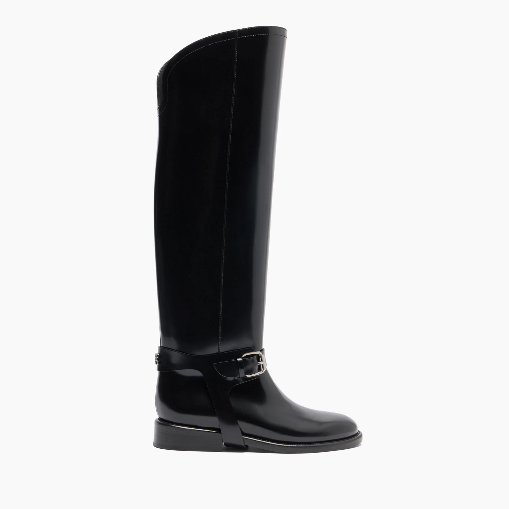 Casadei ferries equestrian chicness to the city as a must-have style to face winter. The Riderama, in smooth black yet durable leather, is a must-have for the season. The asymmetrical shaft is knee-high and buckles adorn the model's silhouette. It features a leather bottom. Details - Abrasive calfskin leather - 100% Calf - Leather bottom - 100% Made In Italy - Code: 1S372A0201C28589000