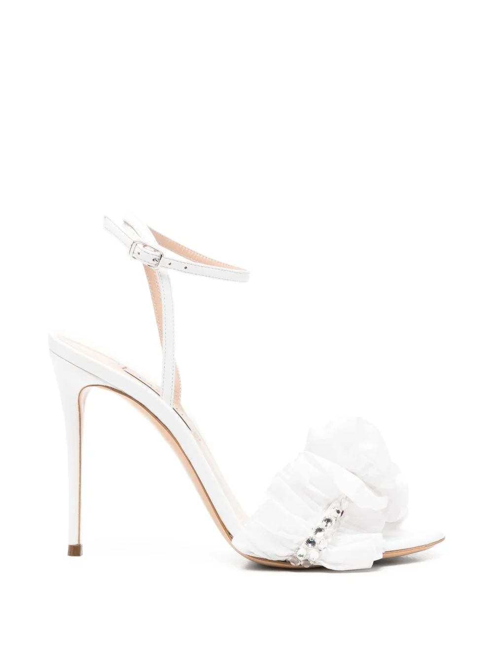 ruffled embellished sandals Highlights - White - Crystal embellishment - Ruffle detail - Buckle fastening - Thin ankle strap - Open toe Made in Italy Composition Outer: Fabric 100%, Crystal 100%, Calf Leather 100% Lining: Calf Leather 100% Sole: Calf Leather 100% SIZE & FIT Measurement HEEL 4.52 in(11.5 cm)