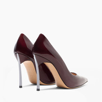 Striking a perfect balance between femininity and design, the Maison's iconic Blade pump, which is distinguished by its blade-sharp steel Blade heel, is presented in the samurai material: a patent leather in the color black cherry with delicate metallization that enhances the model's colors and shine. Details - Patent leather with soft metallic finish to highlight the colour and brilliance - 100% Calf - Blade heel in stainless steel 100 mm / 3.9 inches - 100% Made In Italy - Code: 1F915W100MC28344408