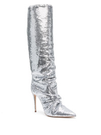 sequinned boots Highlights - Silver-tone - Calf leather - Sequin embellishment - High heel - Pointed toe - Knee-high Made in Italy Composition Lining: Calf Leather 100% Sole: Calf Leather 100% Outer: Fabric 100%, Sequin 100% SIZE & FIT Measurement CIRCUMFERENCE 13.38 in(34 cm) HEEL 4.33 in(11 cm) HEIGHT 15.35 in(39 cm)