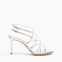 For all those who wish to shine with elegance, Casadei presents the Cage Starsway sandal in silver mirror-effect fabric on a metalized background. Its luminous crystals create a sparkling effect that catches every eye. The asymmetrical cages that encircle the foot are embellished with small, diamond-like sparkles, adding a touch of magic and sophistication. On the 8 cm Julia heel, this model will become a must-have in your wardrobe, ready to make you shine on any special occasion! Details - Mirror effect fabric on a metallic background - 40% Polyester and 60% Polyurethane - Mirror effect fabric covered heel 80 mm / 3.1 inches - 100% Made In Italy - Code: 1L400A0801T05359700