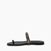 Elegance becomes essential with Casadei's Vegas flat, a creation that combines comfort and refinement in every detail. Made of black leather, this minimalist model is embellished with a bracelet studded with multicoloured mignon stones, which capture the light and reflect vibrations of pure elegance. The toe ring delicately wraps around the foot, adding a contemporary and sophisticated touch. Perfect for completing summer looks with style, it is the jewelled sandal that does not go unnoticed — even without heels. Perfect for sophisticated evening looks or elegant events, it’s the right choice for those seeking timeless sensuality and charm. Details - Nappa - 50% Kid and 50% Polyamide with glass - Blade Heel In Real Steel 100 Mm/ 3.9 Inches - 100% Made in Italy - Code: 1N250B0101C29549000