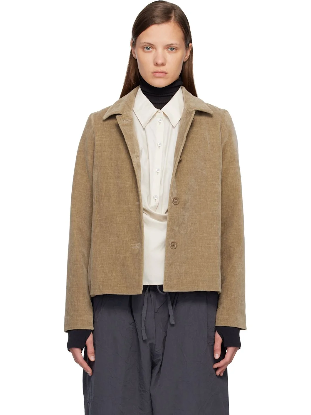 Cotton velvet jacket. · Spread collar · Button closure · Seam pockets · Darts at back · Full crinkled cotton poplin lining · Corozo hardware Supplier color: Beige 100% cotton. Made in Bulgaria 252007F063003