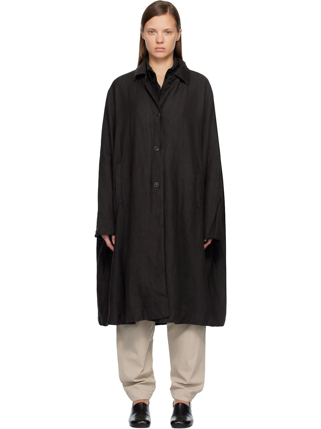 Linen- and virgin wool-blend twill coat. · Spread collar · Button closure · Welt pockets · Dropped shoulders · Full crinkled cotton poplin lining · Corozo hardware Supplier color: Dark brown Body: 55% linen, 45% virgin wool. Lining: 100% cotton. Made in Romania 252007F059008