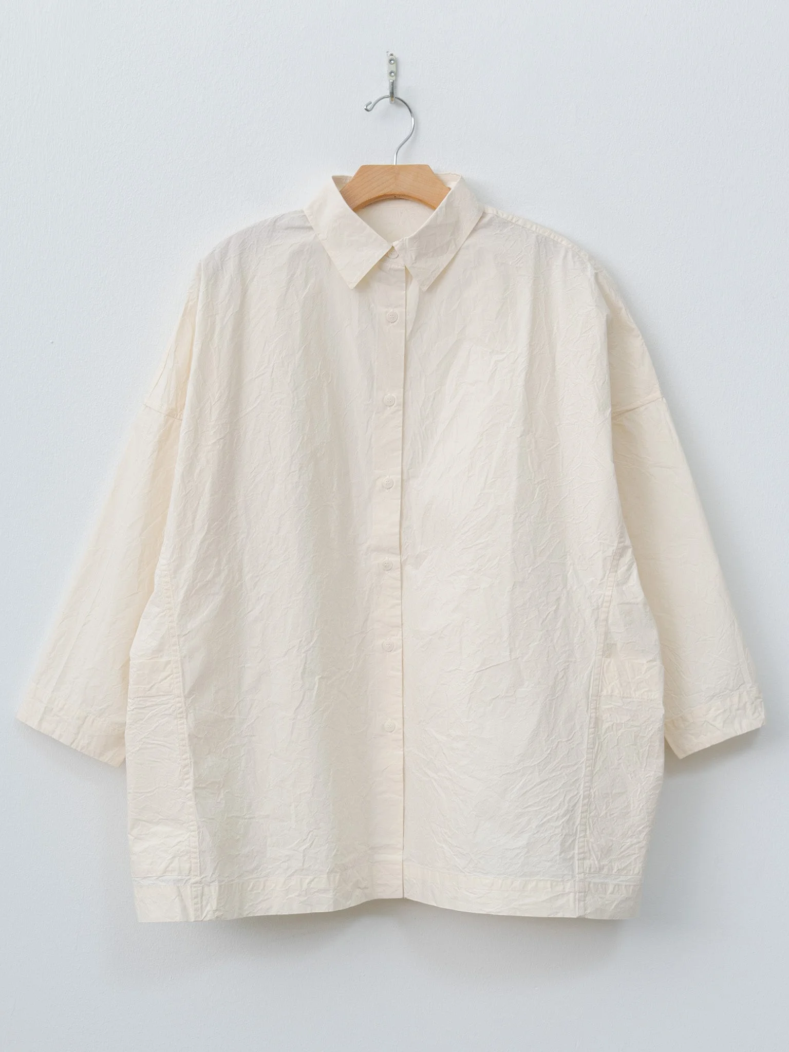From Casey Casey a relaxed fit shirt featuring buttoned patch pockets on the sides. It is made from a textured, light-to-midweight cotton with a washed finish. Details include a regular collar, 7/8 sleeves, dropped shoulders, a corozo button front and a straight hem. - Made in the EU - 100% Cotton - Available in Natural - The model is 5'8"/173cm and wears size S
