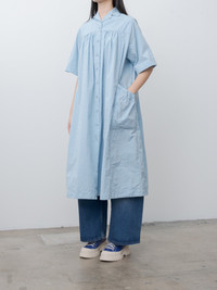 The Rhythme Dress is made from a taffeta cotton blend with a washed finish. It features yoke detailing on the front and back, large gathered patch pockets and corozo button closure all the way down. The gathered fabric at the chest adds subtle volume to the silhouette. - Made in France - 89% Cotton, 11% Polyamide - Available in Black, Sky Blue - The model is 5'7"/170cm and wears size S