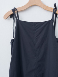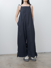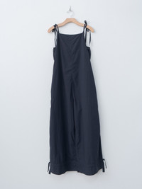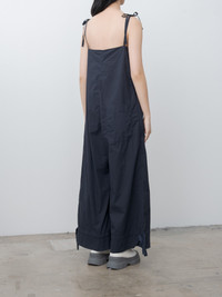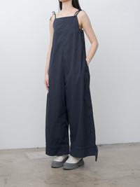 A relaxed fit, wide leg jumpsuit from Casey Casey featuring tied shoulder straps and drawstrings at the hem for adjustable tapering. The fabric is a lightweight cotton with a washed finish. Details include a straight neckline, elasticated sides at the bust, side pockets and a back patch pocket. - Made in France - 100% Cotton - Available in Night (dark navy) - The model is 5'7"/170cm and wears size S