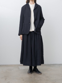 The Val Jacket is a three-button tailored style featuring a notched lapel and a softly structured silhouette. Crafted from lightweight Fosca virgin wool gauze, it offers warmth and comfort without added weight. Details include front patch pockets with button closures, corozo button front, curved front hem, back vent, and wool lining. - Made in France - 100% Virgin Wool, Lining: 100% Virgin Wool - Available in Blue (navy) - Coordinating item with Up Up Skirt FOSCA - The model is 5'7"/170 cm and wears size S