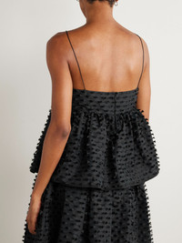 Cecilie Bahnsen's 'Babette' top showcases the Scandi designer's love of texture and dramatic proportions. It's made from tactile fil coupe shell with a fitted bust and peplum hem, inspired by babydoll silhouettes. Style yours with the matching 'Mala' skirt for maximum impact. Size & Fit - Fits true to size, take your normal size - Those with a large bust may wish to take the next size up - Intended for a loose fit - Lightweight, non-stretchy fabric - Model is 177cm/ 5'10" and is wearing a UK 10 Model measurements: - Bust: 86cm/ 34" - Waist: 65cm/ 25.5" - Hip: 90cm/ 35.5" Details & Care - Black fil coupe shell - Concealed hook and zip fastening at back - 100% polyester; lining: 73% acetate, 27% silk - Fully lined - Dry clean