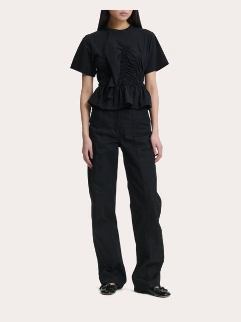 Cecilie Bahnsen's take on the traditional T-shirt, the Ace top manipulates its bodice with shirred and ruffled details. Gathered along the seam, the flared peplum hem creates voluminous shape. Designer color: black Pull-on Draped front ruffle Shirred bodice Flared peplum hem Jersey 90% cotton, 10% elastane Machine wash cold, dry flat Made in Portugal Size & Fit Garment measurements (size XS / UK 6): 15.63in long from center front neckline to hem, 34.65in bust, 23.62in waist Garment measurements (size S / UK 8): 15.79in long from center front neckline to hem, 36.22in bust, 25.2in waist Garment measurements (size M / UK 10): 15.94in long from center front neckline to hem, 37.8in bust, 26.77in waist Garment measurements (size L / UK 12): 16.14in long from center front neckline to hem, 39.37in bust, 28.35in waist Garment measurements (size XL / UK 14): 16.26in long from center front neckline to hem, 40.94in bust, 29.92in waist Model (wearing size S): 5ft 8in tall Fits true to size UK 6 = US 2 / XS UK 8 = US 4 / S UK 10 = US 6 / M UK 12 = US 8 / L UK 14 = US 10 / XL