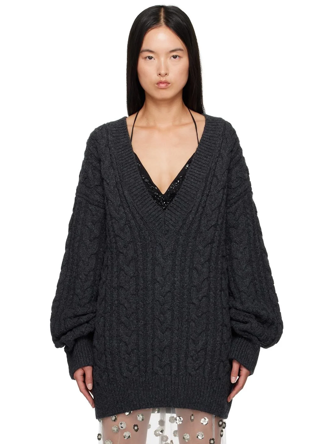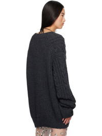 Cable-knit and rib-knit merino wool sweater. · Positive Luxury Butterfly Mark-certified · Plunging V-neck · Dropped shoulders Supplier color: Charcoal grey 100% merino wool. Made in Portugal 242002F100000
