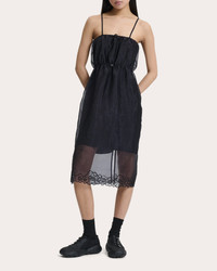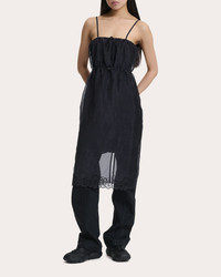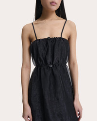 Drawing inspiration from vintage nightgowns, the Barr dress defines its shape with a cinched drawstring waist. The liquid myrtia silhouette is finished with a sheer, floral embroidered hem to create gauzy dimension. Designer color: black Pull-on Floral drawcords (neckline, waist) Cinched waistline Sheer hem with floral embroidery Center back slit Liquid myrtia Self: 55% polyamide, 45% polyester Lining: 100% cupro Dry clean Made in Latvia Size & Fit Garment measurements (size UK 6 / US 2): 36.61in long from center front neckline to hem, 29.92in bust Garment measurements (size UK 8 / US 4): 36.81in long from center front neckline to hem, 31.5in bust Garment measurements (size UK 10 / US 6): 37.01in long from center front neckline to hem, 33.07in bust Garment measurements (size UK 12 / US 8): 37.2in long from center front neckline to hem, 34.65in bust Garment measurements (size UK 14 / US 10): 37.4in long from center front neckline to hem, 36.22in bust Garment measurements (size UK 16 / US 12): 37.6in long from center front neckline to hem, 37.8in bust Model (wearing size US 4 / UK 8): 5ft 8in tall Fits true to size UK 6 = US 2 / XS UK 8 = US 4 / S UK 10 = US 6 / M UK 12 = US 8 / L UK 14 = US 10 / XL