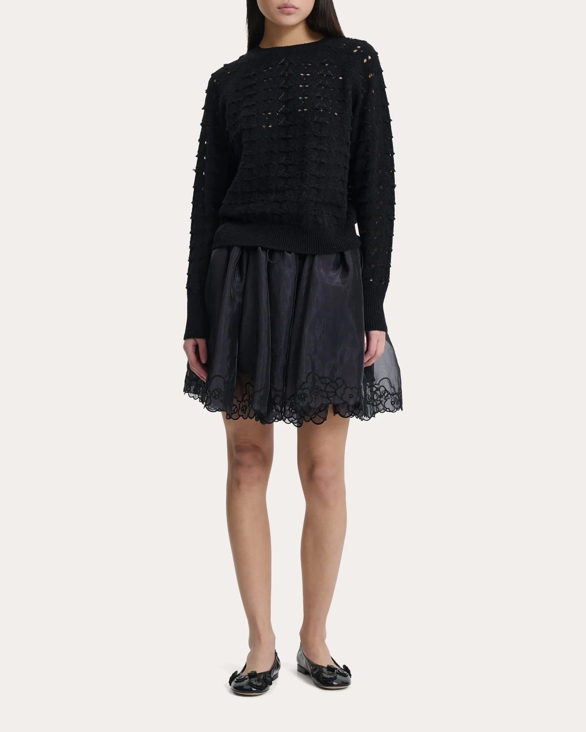 Spun from responsibly sourced wool, the Bidane sweater embraces airy texture with its openworked heritage lace knit. Contrast ribbing along the collar, cuffs and hem creates opaque dimension. Designer color: black Pull-on Raglan shoulders Contrast rib trim Heritage lace knit 100% RWS wool Dry clean Made in Romania Size & Fit Garment measurements (size S): 19.3in long from high point of shoulder to hem, 20.1in chest width, 19.48in hem width, 31.5in sleeve length Garment measurements (size M): 19.7in long from high point of shoulder to hem, 20.9in chest width, 31.7in sleeve length Garment measurements (size L): 20.1in long from high point of shoulder to hem, 21.7in chest width, 31.9in sleeve length Model (wearing size S): 5ft 8in tall Fits true to size UK 6 = US 2 / XS UK 8 = US 4 / S UK 10 = US 6 / M UK 12 = US 8 / L UK 14 = US 10 / XL
