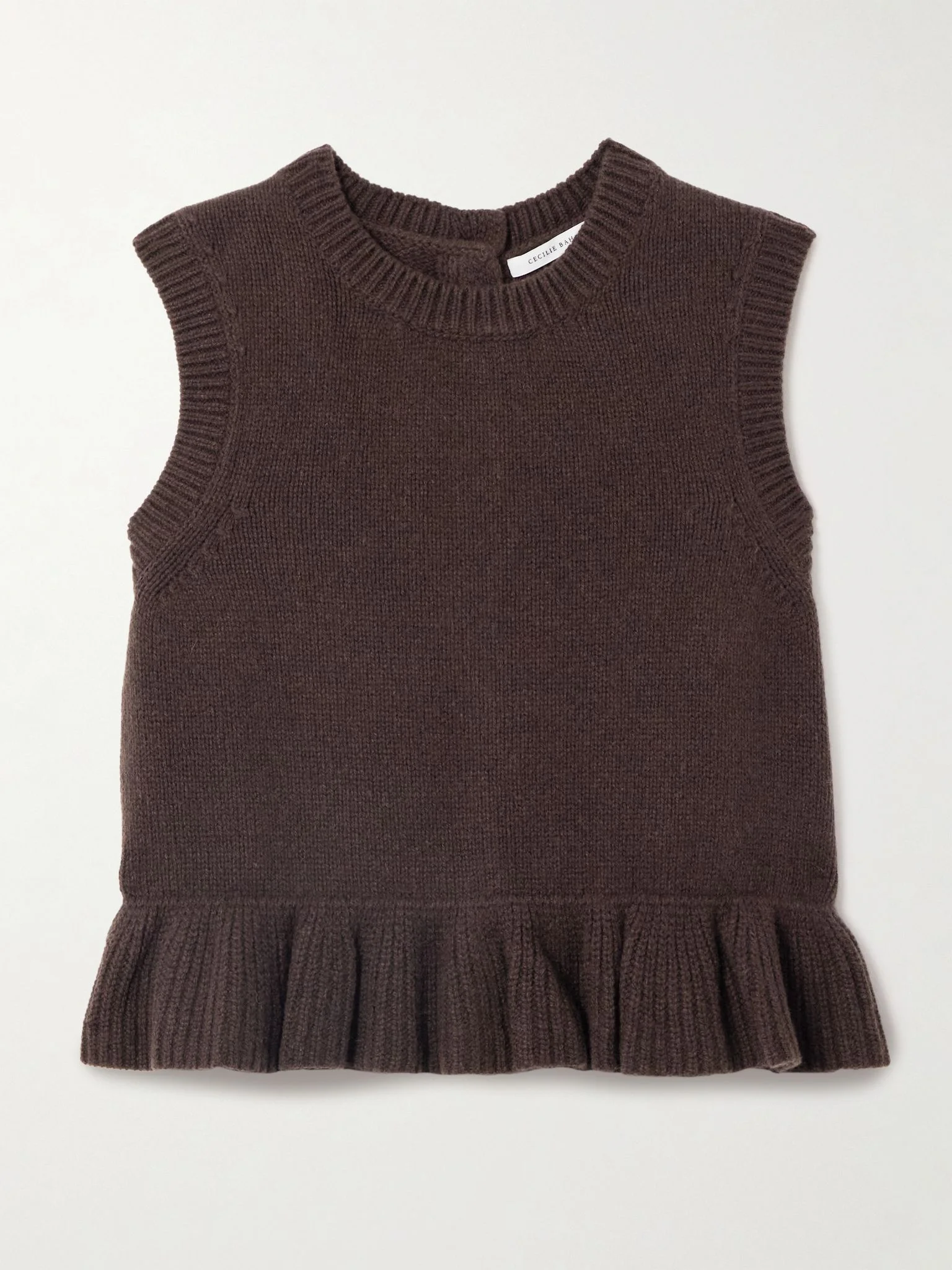 Cecilie Bahnsen's 'Bill' tank is designed with a ruffled peplum hem and floral buttons that nod to the label's playful femininity. It's made from a cozy and insulating cashmere and wool-blend and has a slim fit. Size & Fit - Fits true to size, take your normal size - Designed for a slim fit - Mid-weight knit - Model is 177cm/ 5'10" and is wearing a size Small Model measurements: - Bust: 86cm/ 34" - Waist: 65cm/ 25.5" - Hip: 90cm/ 35.5" Details & Care - Chocolate cashmere and wool-blend - Concealed zip fastening along back - 97% cashmere, 3% wool - Dry clean
