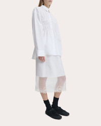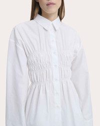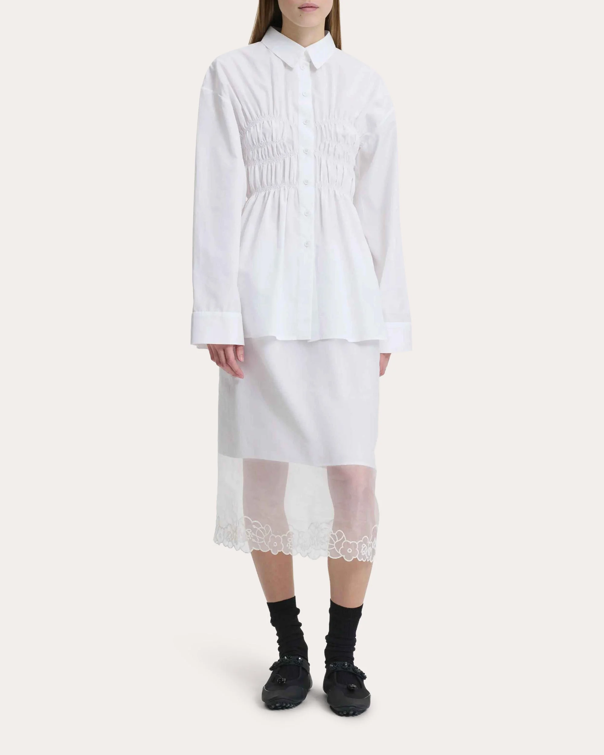 A reflection of Cecilie Bahnsen's exaggerated aesthetic, the Braxton shirt creates feminine shape with dimensional ruching throughout the bodice. The collared neckline, cuffed sleeves and front button placket give nod to traditional tailoring. Designer color: white Front button closure Collared neckline Dropped shoulders Button sleeve cuffs Curved high-low hem Ruched bodice 100% cotton Hand wash, dry flat Made in Latvia Size & Fit Garment measurements (size UK 6 / US 2): 28.5in long from center front neckline to hem, 21.3in chest width, 49.6in hem circumference Garment measurements (size UK 8 / US 4): 28.9in long from center front neckline to hem, 22.8in chest width, 52.8in hem circumference Garment measurements (size UK 10 / US 6): 29.3in long from center front neckline to hem, 24.4in chest width, 55.9in hem circumference Garment measurements (size UK 12 / US 8): 29.6in long from center front neckline to hem, 26in chest width, 59.1in hem circumference Garment measurements (size UK 14 / US 10): 30in long from center front neckline to hem, 27.6in chest width, 62.2in hem circumference Garment measurements (size UK 16 / US 12): 30.4in long from center front neckline to hem, 29.1in chest width, 65.4in hem circumference Model (wearing size US 4 / UK 8): 5ft 8in tall This style is intended to have an exaggerated fit. UK 6 = US 2 / XS UK 8 = US 4 / S UK 10 = US 6 / M UK 12 = US 8 / L UK 14 = US 10 / XL