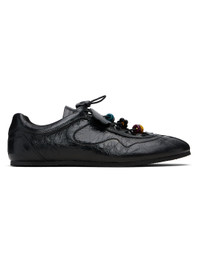 Low-top crinkled polished leather sneakers. · Certified Positive Luxury Butterfly Mark · Lace-up closure with floral cord-lock hardware · Beads and graphic appliques at vamp · Padded collar · Goatskin lining · Treaded crepe rubber sole Supplier color: Black Upper: leather. Sole: thermoplastic rubber. Made in Portugal 252002F128000