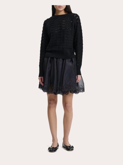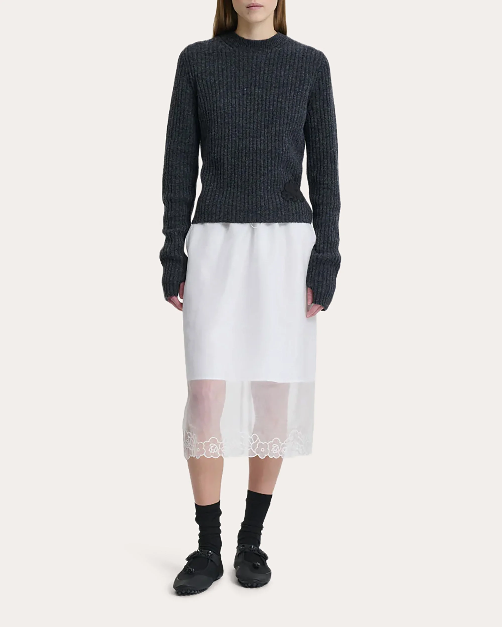 Brought to life in a Nordic-style rib knit, the Blas sweater embraces Cecilie Bahnsen's feminine aesthetic with embroidered floral applique at one side. The wool silhouette is finished with long thumbhole sleeves for added warmth. Designer color: dark gray Pull-on Thumbhole sleeves Embroidered floral applique Nordic rib knit 100% RWS wool Dry clean Made in Romania Size & Fit Garment measurements (size S): 23.2in long from high point of shoulder to hem, 17.3in chest width, 14.76in hem width, 14.2in sleeve length Garment measurements (size M): 23.6in long from high point of shoulder to hem, 18.1in chest width, 14.6in sleeve length Garment measurements (size L): 24in long from high point of shoulder to hem, 18.9in chest width, 15in sleeve length Model (wearing size S): 5ft 8in tall Fits true to size UK 6 = US 2 / XS UK 8 = US 4 / S UK 10 = US 6 / M UK 12 = US 8 / L UK 14 = US 10 / XL