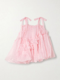 Cecilie Bahnsen's 'Cristina' dress is equally sweet and playful. It's made layers of from lustrous taffeta that's slightly sheer and has a crinkled finish and has ruffles framing the square neck and tiered mini skirt. Knot the adjustable shoulder ties into bows. Size & Fit - Fits true to size, take your normal size - Designed to be fitted at the bust, loose at the waist and hip - Fully adjustable shoulder straps - Lightweight, non-stretchy fabric - Model is 180cm/ 5'11" and is wearing a UK 8 Model measurements: - Bust: 80cm/ 31.5" - Waist: 65cm/ 25.5" - Hip: 89cm/ 35" Details & Care - Baby-pink crinkled-taffeta - Slips on - 55% polyamide, 45% polyester; lining: 53% cupro, 47% polyester - Fully lined - Dry clean
