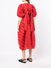 Finnegan textured midi dress bright red cotton blend flared textured finish round neck rear tie fastening short puff sleeves elasticated cuffs mid-length Made in United Kingdom Composition Cotton 80%, Polyester 20% SIZE & FIT Model measurements Height 5 ft 11 in(1.8 m) Bust/Chest 28.34 in(72 cm) Hips 35.43 in(90 cm) Waist 23.62 in(60 cm) FittingInformation This piece fits true to size. We recommend you get your regular size Designed for a close fit at the bust and waist, but loose at the hip Made with a mid-weight non-stretch fabric Washing instructions Dry Clean Only