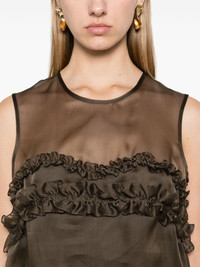 Orietta blouse Highlights - Olive brown - Silk - Organza - Rear tie fastening - Crew neck - Sleeveless - Semi-sheer panels - Ruffled detailing - Partial lining - Straight hem Imported Composition Lining: Viscose 95%, Elastane 5% Outer: Silk 100% SIZE & FIT Model measurements Height 5 ft 9 in(1.75 m) Bust/Chest 31.88 in(81 cm) Hips 34.64 in(88 cm) Waist 24.01 in(61 cm) FittingInformation Designed to be unstructured, offering a loose fit throughout Made from a lightweight fabric