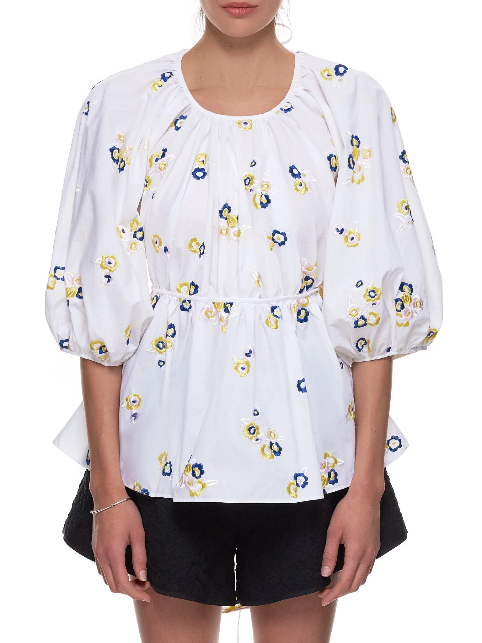 Cecilie Bahnsen round collar, all-over floral embroidery, long sleeves, multiple back ties, exposed back, straight/finished hem, tonal stitching. Made in Lithuania. Composition - 51% Cotton, 49% Polyolefin Model is 5ft 10” and wearing a size 10. Bust: 32.5” Waist: 24” Hip: 35”