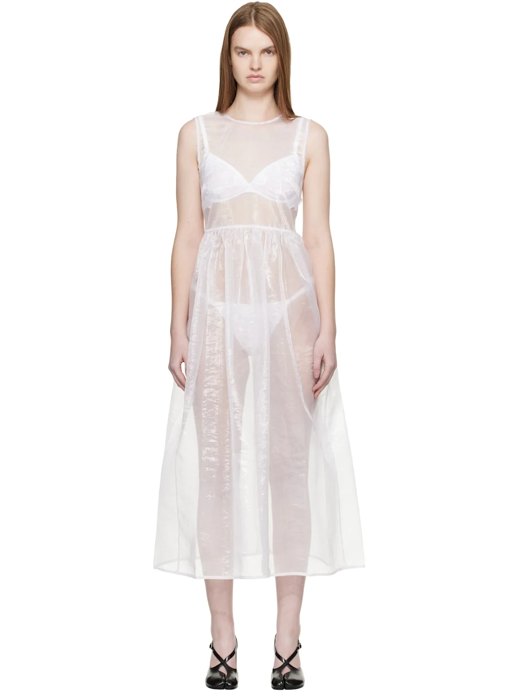 Sheer nylon-blend organza midi dress. · Positive Luxury Butterfly Mark-certified · Round neck · Gathering at waist · Bungee-style drawstrings at open back Supplier color: White 51% polyester, 49% nylon. Made in Latvia 261002F054000