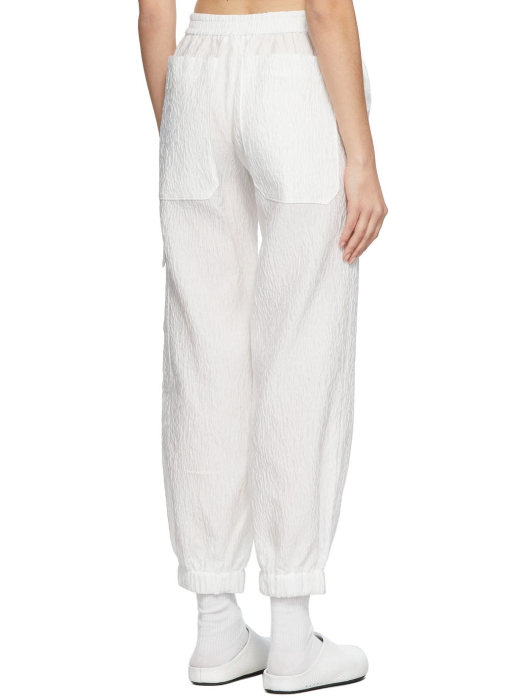 Tapered textured nylon-blend trousers in white. · High rise · Elasticized waistband and cuffs · Five-pocket styling Supplier color: White