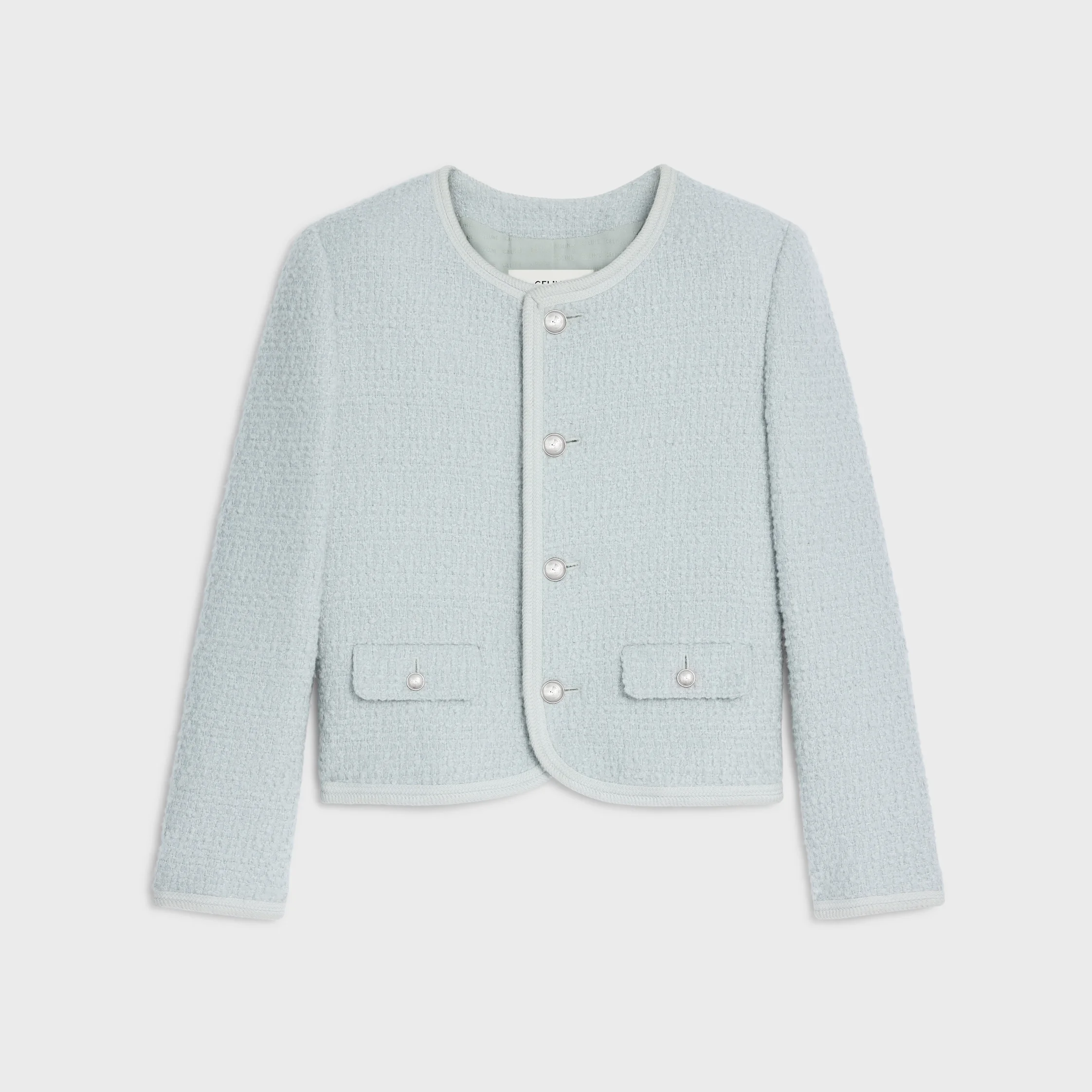 CHELSEA JACKET WITH BRAIDED PIPING IN BOUCLE TWEED CASHMERE DETAILS 65% CASHMERE 30% WOOL 3% SILK 2% POLYAMIDE LINING 51% MODACRYLIC 49% VISCOSE SECONDARY LINING 100% COTTON CLASSIC FIT TAILORED WITH SHOULDER PADS CREW NECK 2 FLAP POCKETS BRAIDED PIPING DETAILS 4 CELINE PARIS-ENGRAVED BUTTONS 1 CELINE PARIS-ENGRAVED BUTTON ON THE POCKET 1 CELINE PARIS-ENGRAVED BUTTONS ON THE CUFFS MADE IN FRANCE REFERENCE: 2V17W593V.07IC
