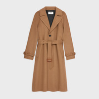 NOTCH COLLAR COAT IN CAMEL CLOTH DETAILS 100% CAMEL LINING 100% COTTON SECONDARY LINING 70% CUPRO 30% COTTON CLASSIC FIT NOTCH COLLAR LONG RAGLAN SLEEVES 2 WELT POCKETS 2 ADJUSTMENT TABS WITH LEATHER BUCKLE ON THE CUFFS MIDDLE BACK VENT 3 CELINE PARIS-ENGRAVED HORN BUTTONS BELT WITH LEATHER BUCKLE AT THE WAIST MADE IN ITALY REFERENCE : 2M65C428T.18TO