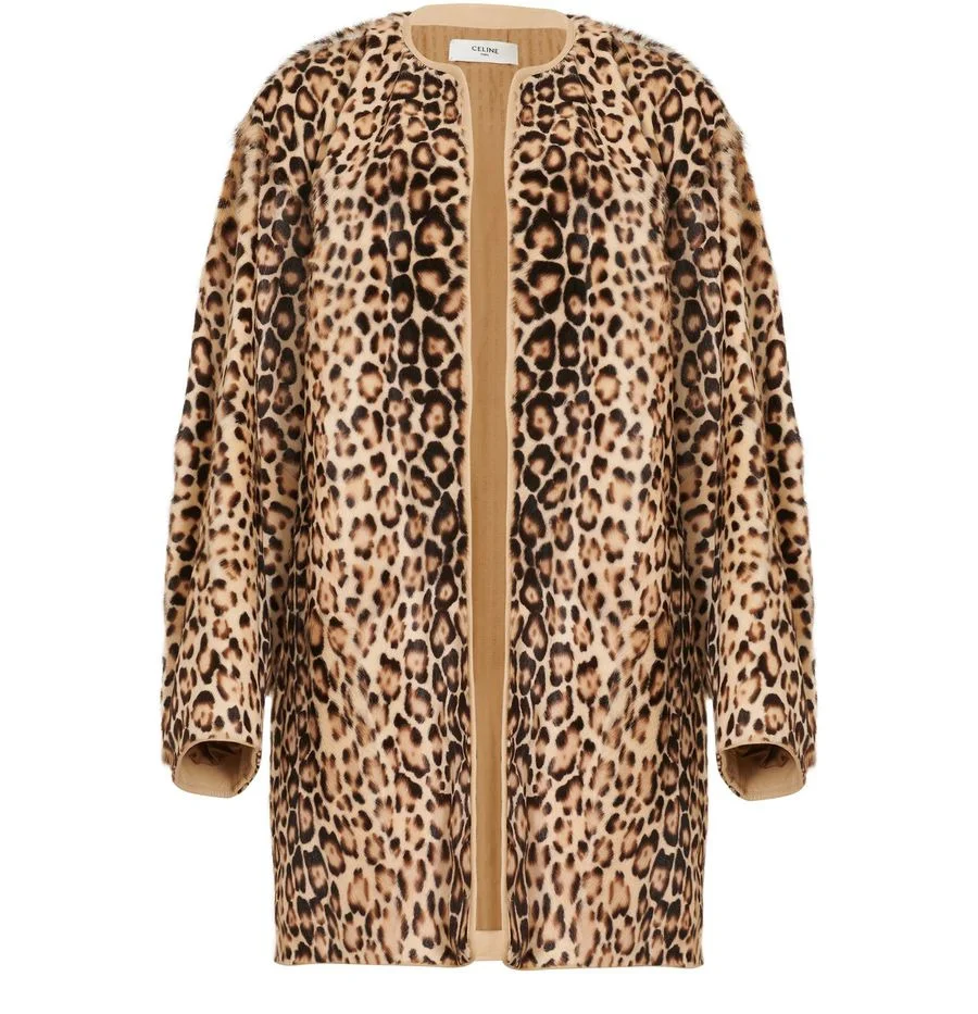 DESCRIPTION - Loose Fit - Crew Neck - Long Sleeves - Dropped Shoulders - Diagonal Side Pockets DETAILS AND CARE MATERIAL: 100% Goatskin/100% Viscose Celine Striped Jacquard Lining/ COLOR: leopard COUNTRY OF MANUFACTURE: Italy PRODUCT CODE: CELU9ZTDMULNA1AA00