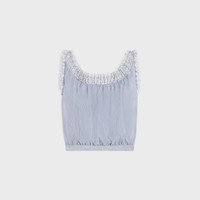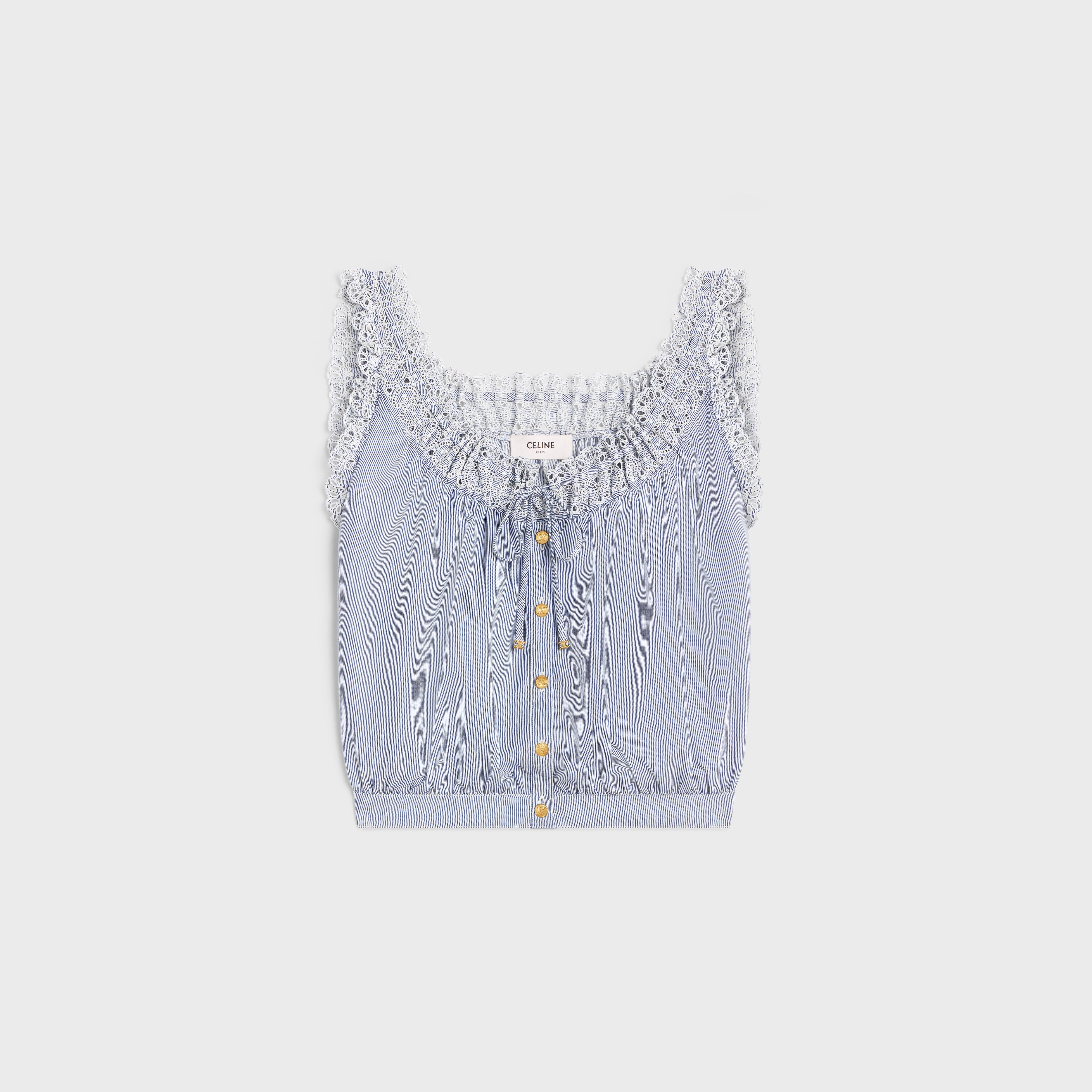 FOLK TOP WITH BRODERIE ANGLAISE IN STRIPED COTTON AND CASHMERE TWILL DETAILS 85% COTTON 15% CASHMERE TRIOMPHE BRODERIE ANGLAISE ON THE NECKLINE CLASSIC FIT CROPPED LENGTH NECKLINE WITH ADJUSTABLE DRAWSTRING AND TRIOMPHE AGLETS TRIOMPHE EMBROIDERED FISH SCALE TRIMS ON THE NECKLINE AND SHOULDERS GATHERED BOTTOM 5 TRIOMPHE BUTTONS MADE IN ITALY REFERENCE : 2B982984T.01NQ