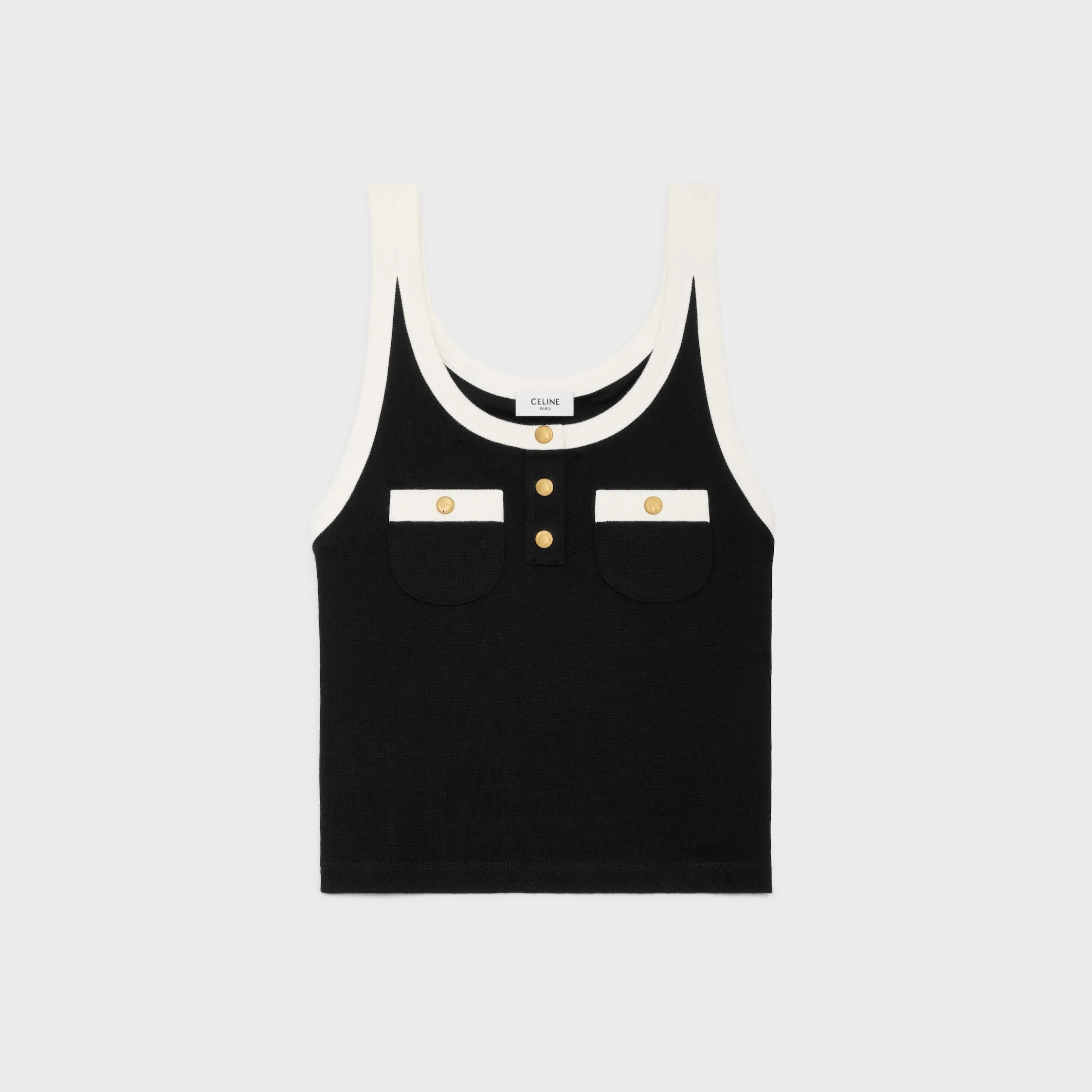 DETAILS CLASSIC FIT CROPPED LENGTH CREW NECK 2 PATCH POCKETS ON THE CHEST 3 CELINE PARIS-ENGRAVED RIVETS 1 CELINE PARIS-ENGRAVED RIVET ON THE POCKET CONTRASTED RIBBED TRIM REFERENCE: RX03A0Q12.38ZD