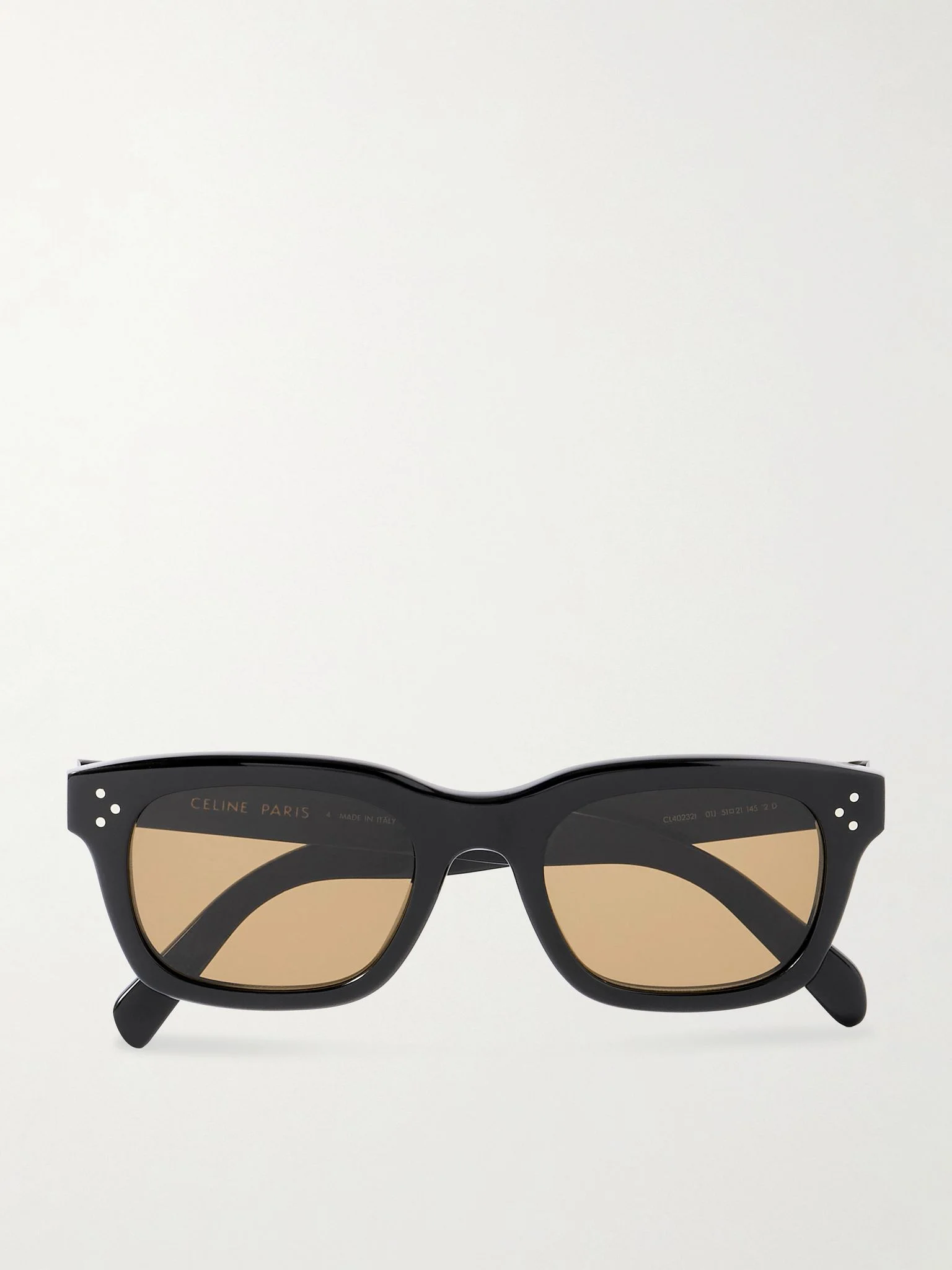Those in the know will recognize CELINE Eyewear's sunglasses by the signature '3 Dots' motif at the temples. Made from black acetate in a classic D-frame shape, they have brown lenses and the logo in gold lettering along the arms. Details & Care - Black acetate - Come with a case - 100% UV protection