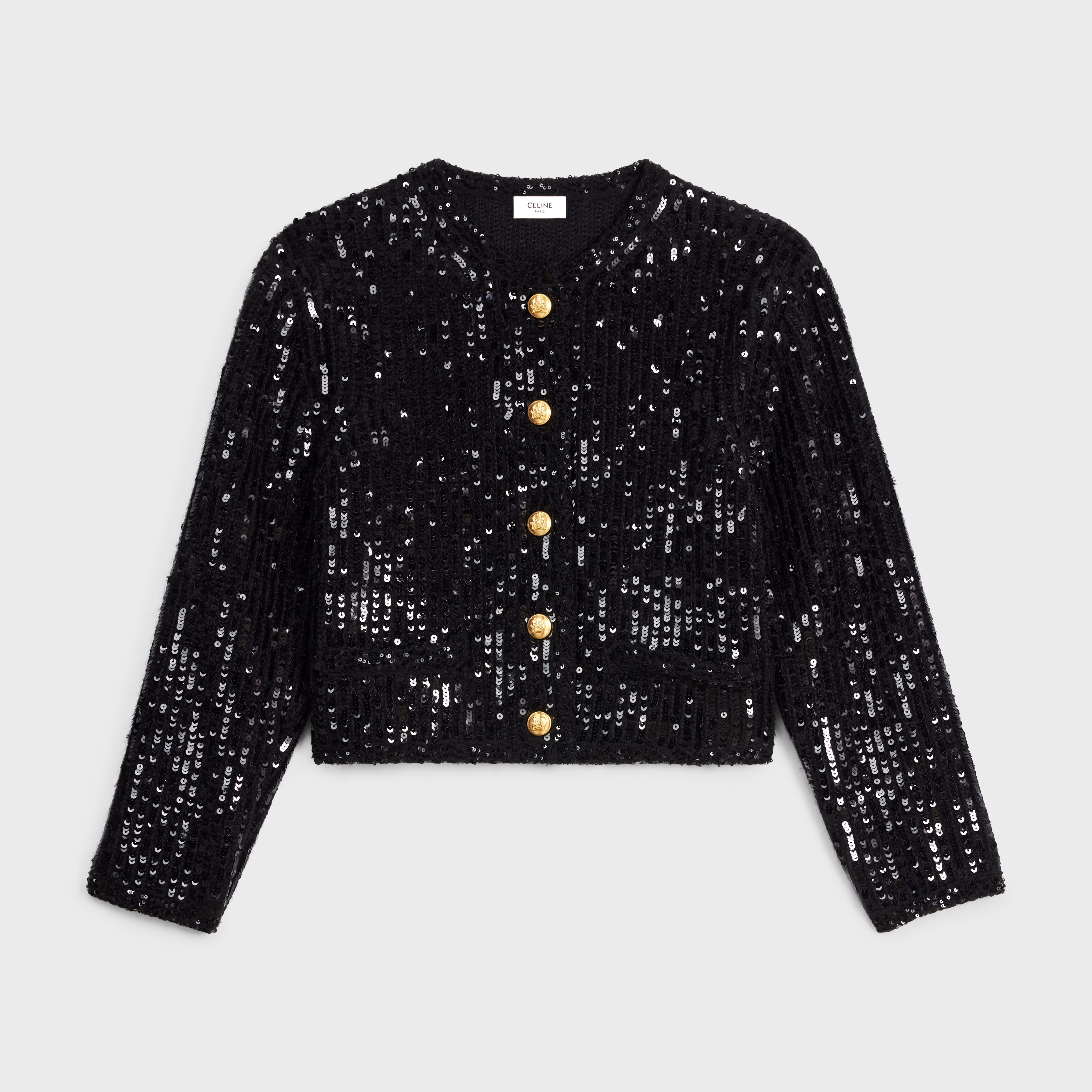 EMBROIDERED CARDIGAN IN RIBBED MOHAIR DETAILS 54% MOHAIR 39% NYLON 7% WOOL ALL-OVER SEQUIN EMBROIDERY CLASSIC FIT CREW NECK 2 WELT POCKETS 5 CELINE "COAT OF ARMS" BUTTONS MADE IN ITALY REFERENCE : 2AB54083T.38NO
