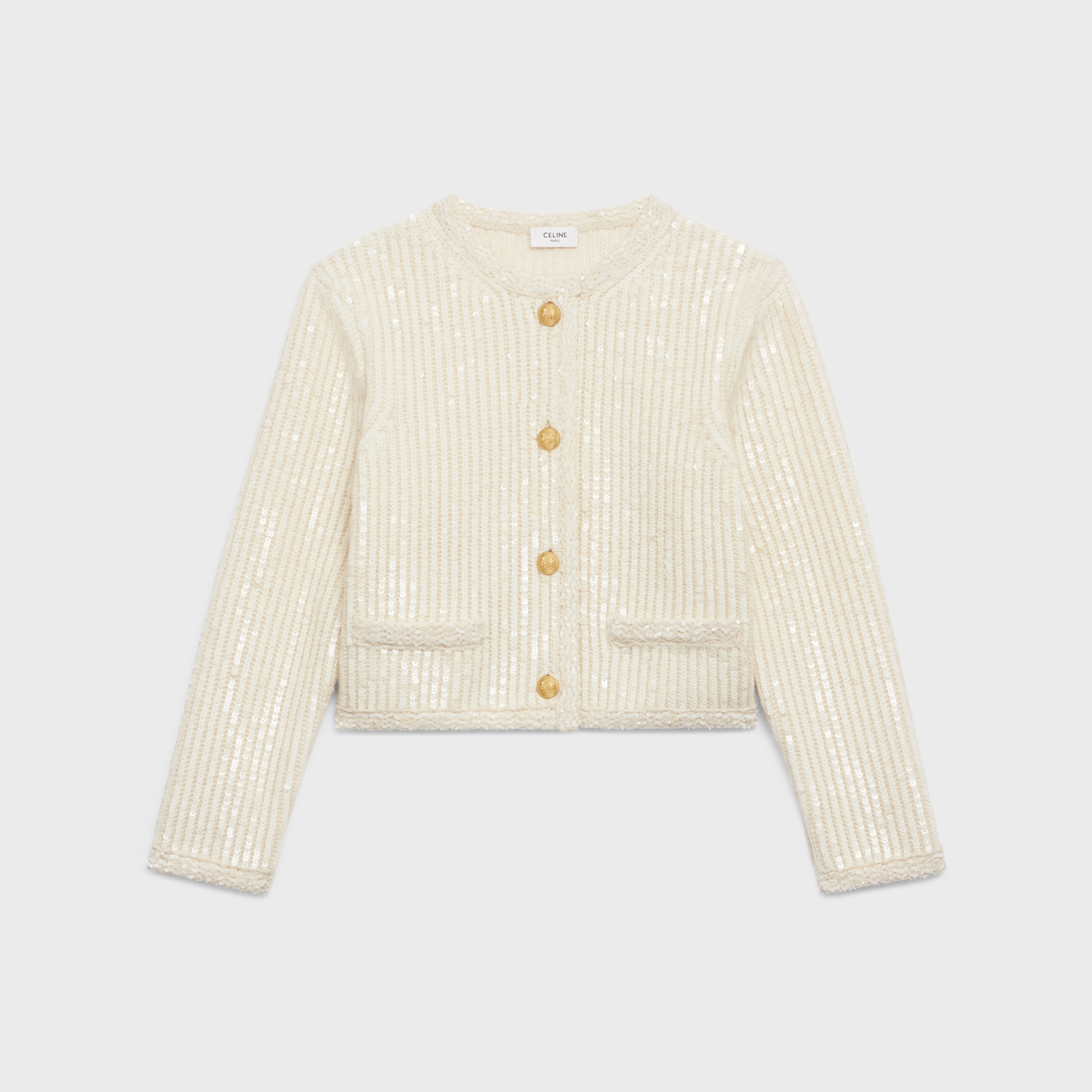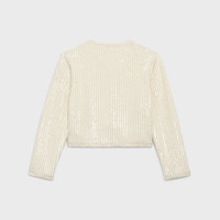 ALL-OVER SEQUIN-EMBROIDERED CARDIGAN JACKET IN RIBBED MOHAIR DETAILS 58% MOHAIR 30% NYLON 12% WOOL ALL-OVER SEQUIN EMBROIDERY CLASSIC FIT CREW NECK 2 WELT POCKETS BRAIDED PIPING 5 CELINE "BLASON" BUTTONS MADE IN ITALY REFERENCE : 2AB54083T.01OW