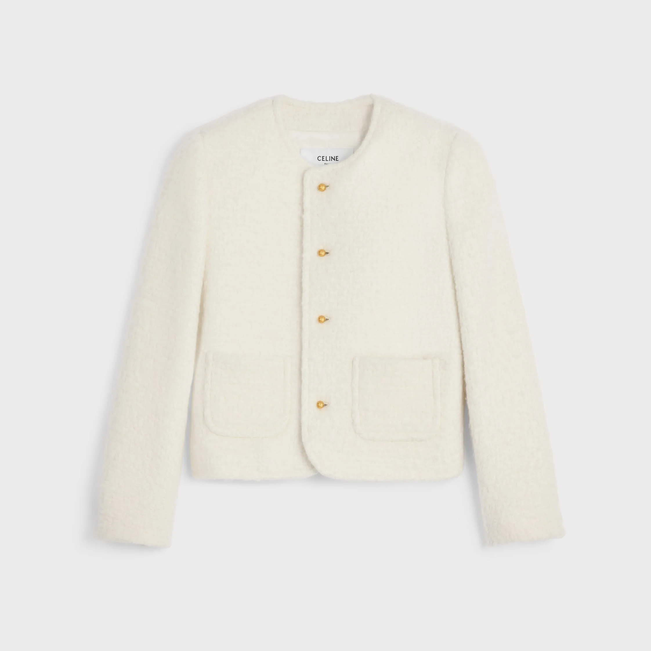 DETAILS 59% CASHMERE 39% WOOL 2% POLYAMIDE CLASSIC FIT TAILORED WITH SHOULDER PADS PURE COLLAR 2 PATCH POCKETS 4 TRIOMPHE BUTTONS 4 TRIOMPHE BUTTONS ON THE CUFFS MADE IN ITALY REFERENCE : 2V18V1086.01BC