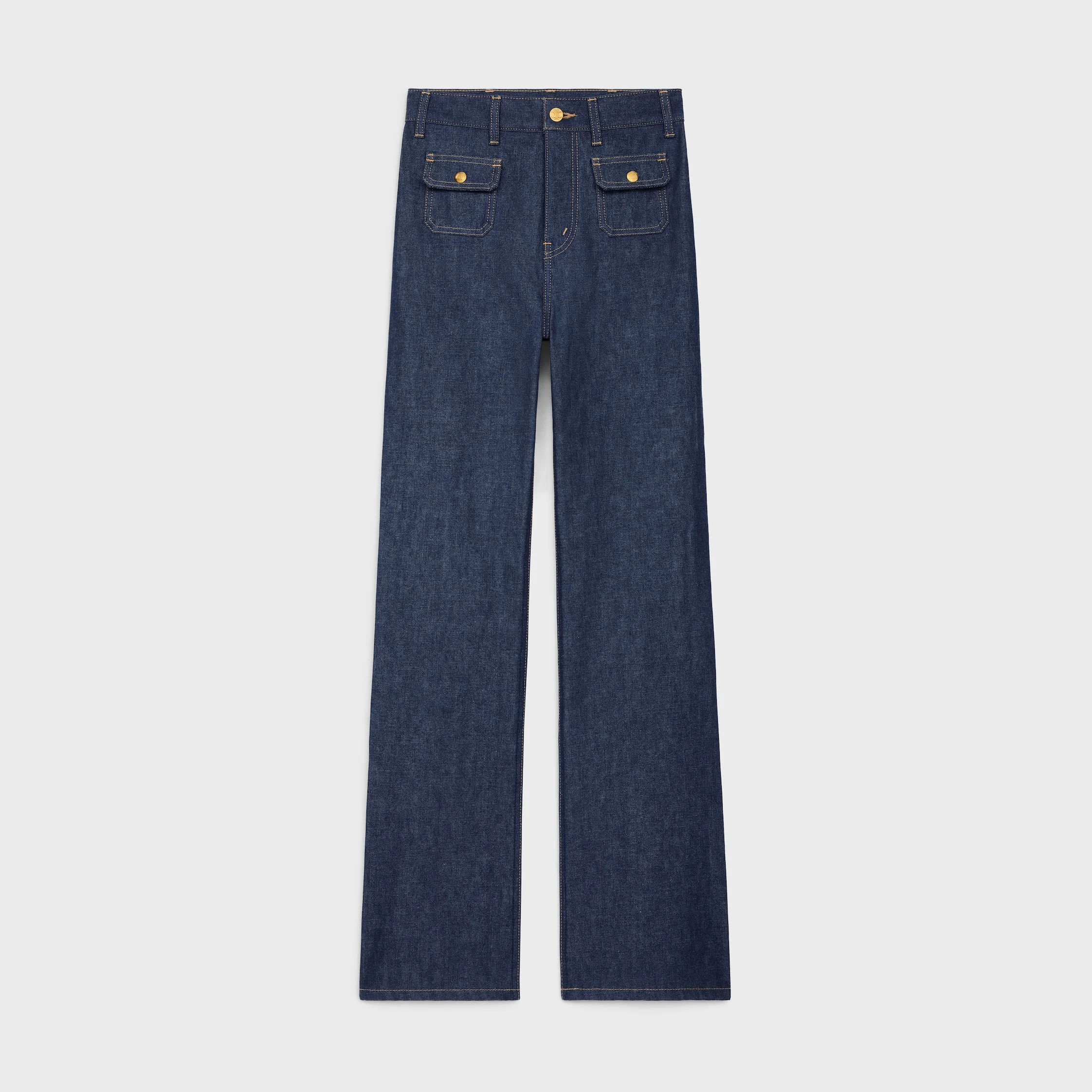 DETAILS 100% COTTON RAW WASH CLASSIC FIT MID-RISE FLARED LEG 2 PATCH POCKETS WITH FLAP AND TRIOMPHE BUTTONS 2 PATCH POCKETS ON THE BACK ZIP AND TRIOMPHE BUTTON MADE IN JAPAN REFERENCE: RP05X558Z.07IA